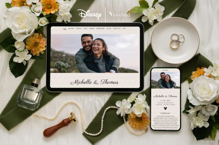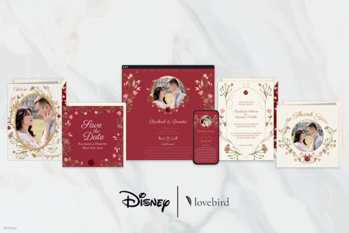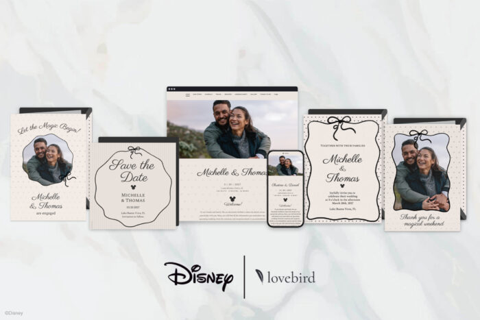 The Disney Collection on Lovebird includes gorgeous Disney wedding websites, digital engagement announcements, save the dates, invitations, and thank you cards — everything an engaged couple needs to manage every touchpoint with their guests in one place and unveil their celebration in true Disney style.