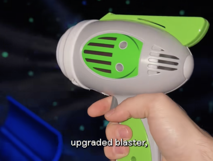 Then, we got a peek at the NEW handheld blasters. Unlike the old version of the ride, you can remove these from their holster for better aiming. They come in red and green.