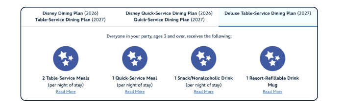 The Disney Dining Plan used to have two tiers — but a third has been added: the Deluxe Table-Service Dining Plan. In 2026, you can continue booking the Disney Quick-Service Dining Plan or Disney Dining Plan. In 2027, you can choose from 3 Disney Dining Plans: the Quick-Service Dining Plan, the Table-Service (or Standard) Dining Plan, or the Deluxe Table-Service Dining Plan.